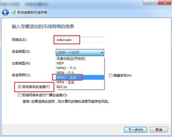 第三步:网络名输入【eduroam】,安全类型选择【WPA2-企业】,选择【下一步】;