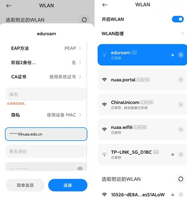 第二步:输入本校eduroam账号和密码,用户名格式为“校园网账号@nuaa.edu.cn”;
